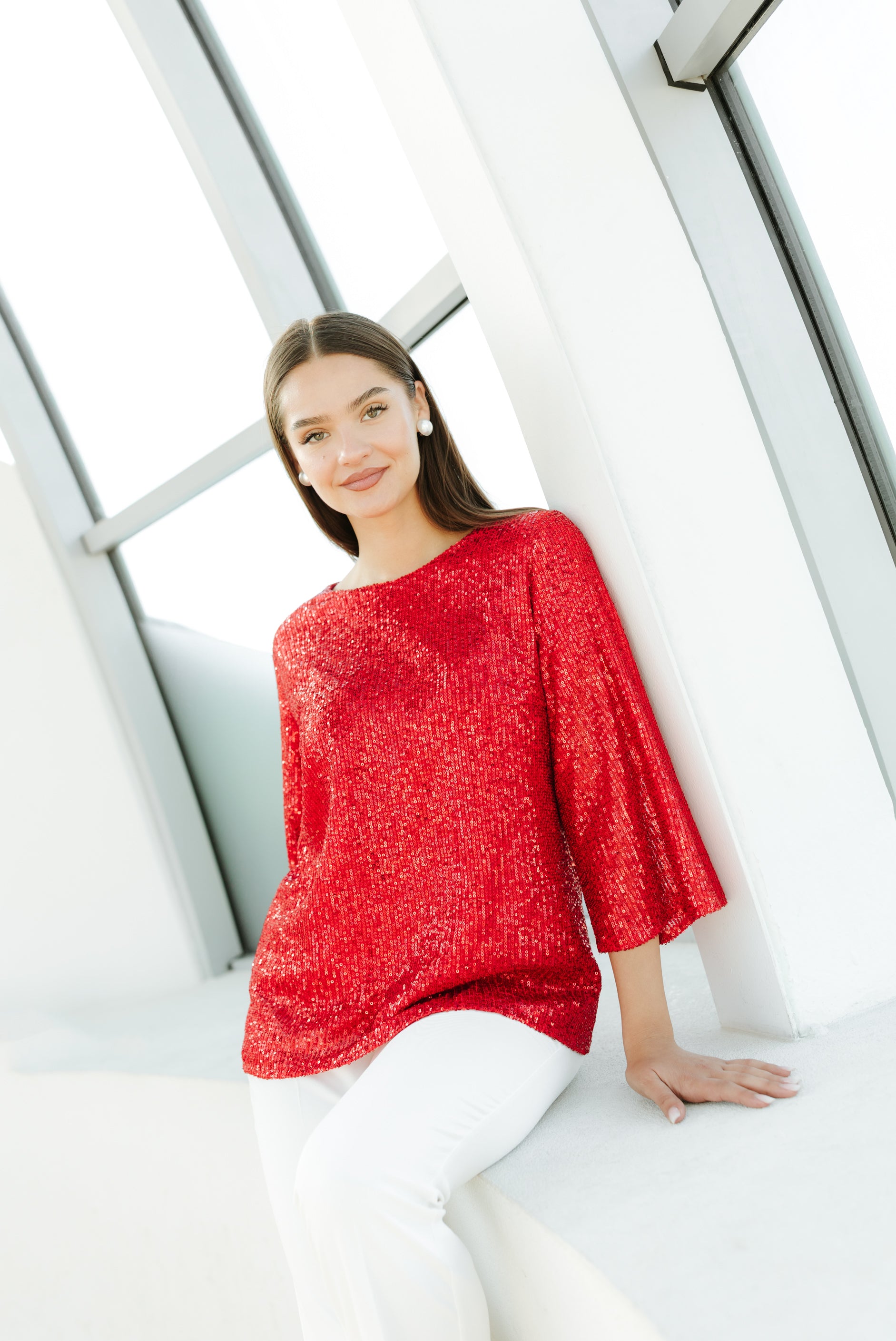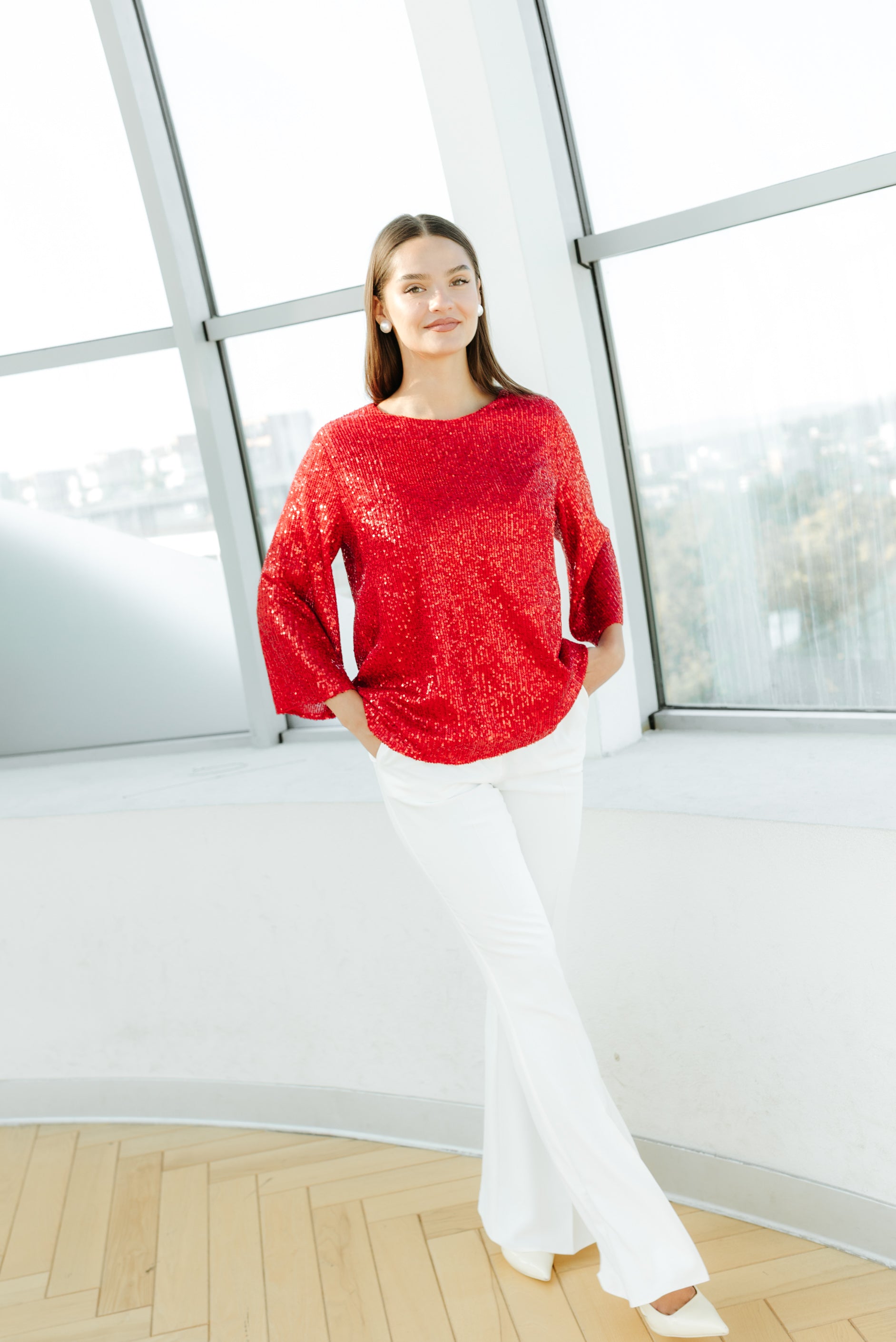 Bluza rosie eleganta din paiete cu catuseala din vascoza. Este lejera si confortabila.