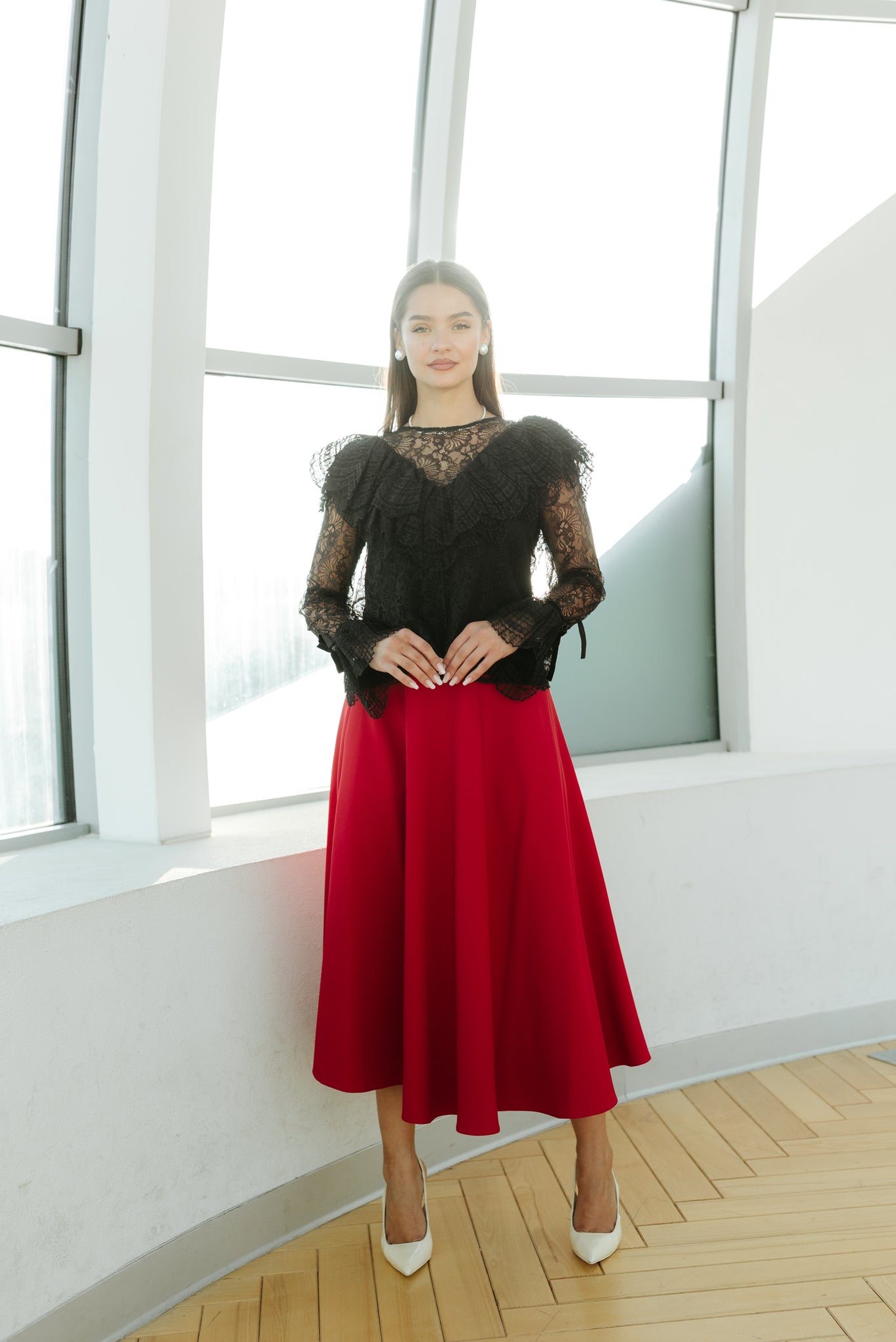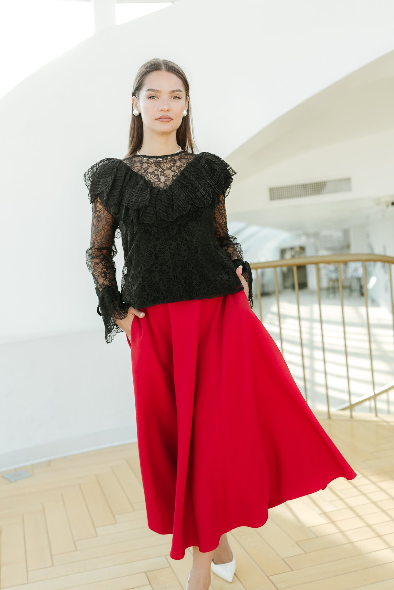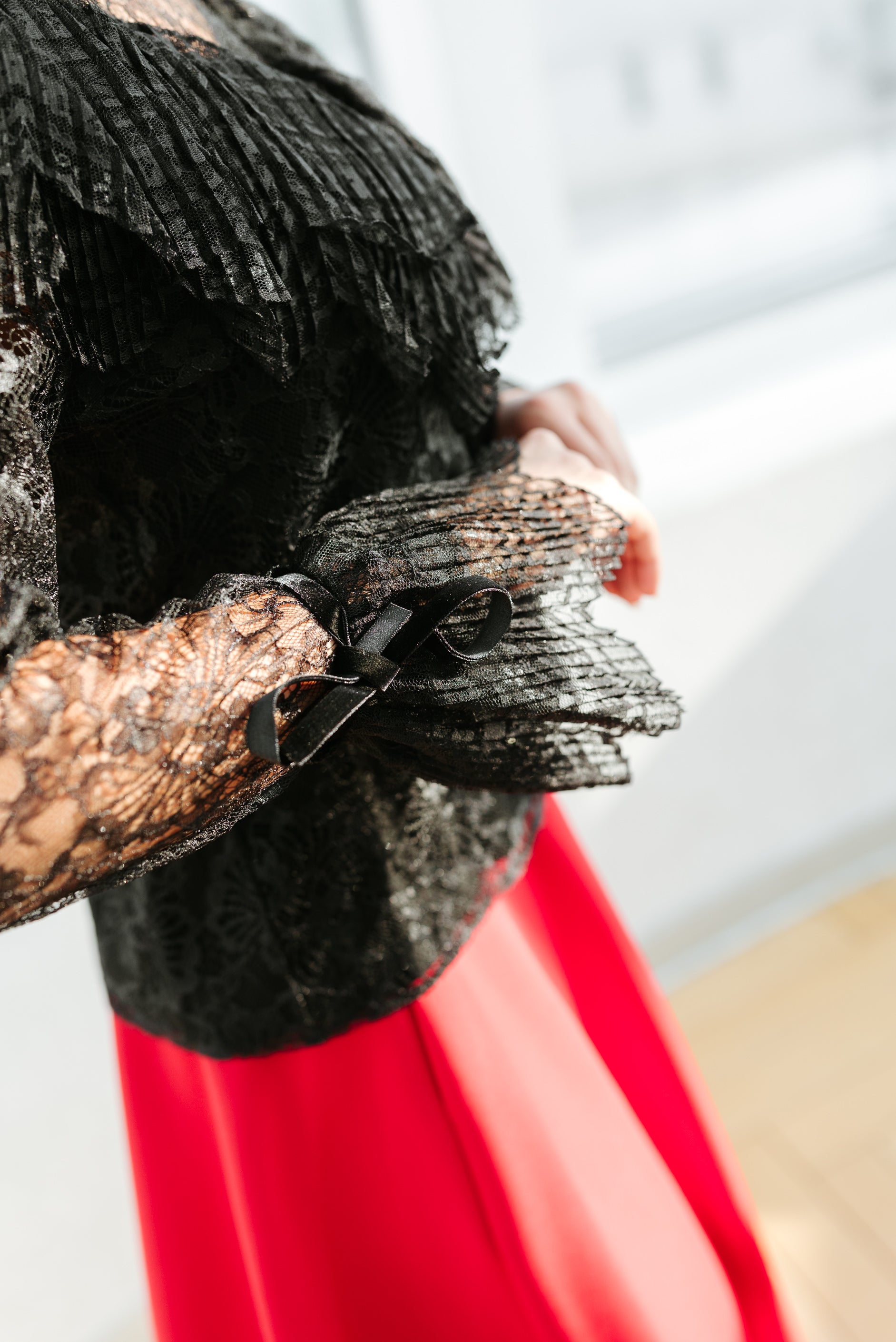 Maneca lunga din dantela are detaliu la terminatie din catifea. Decolteul este la baza gatului. Se asorteaza foarte bine cu pantaloni de catifea, fusta conica, fusta clos sau pantalonii din voal evazati.