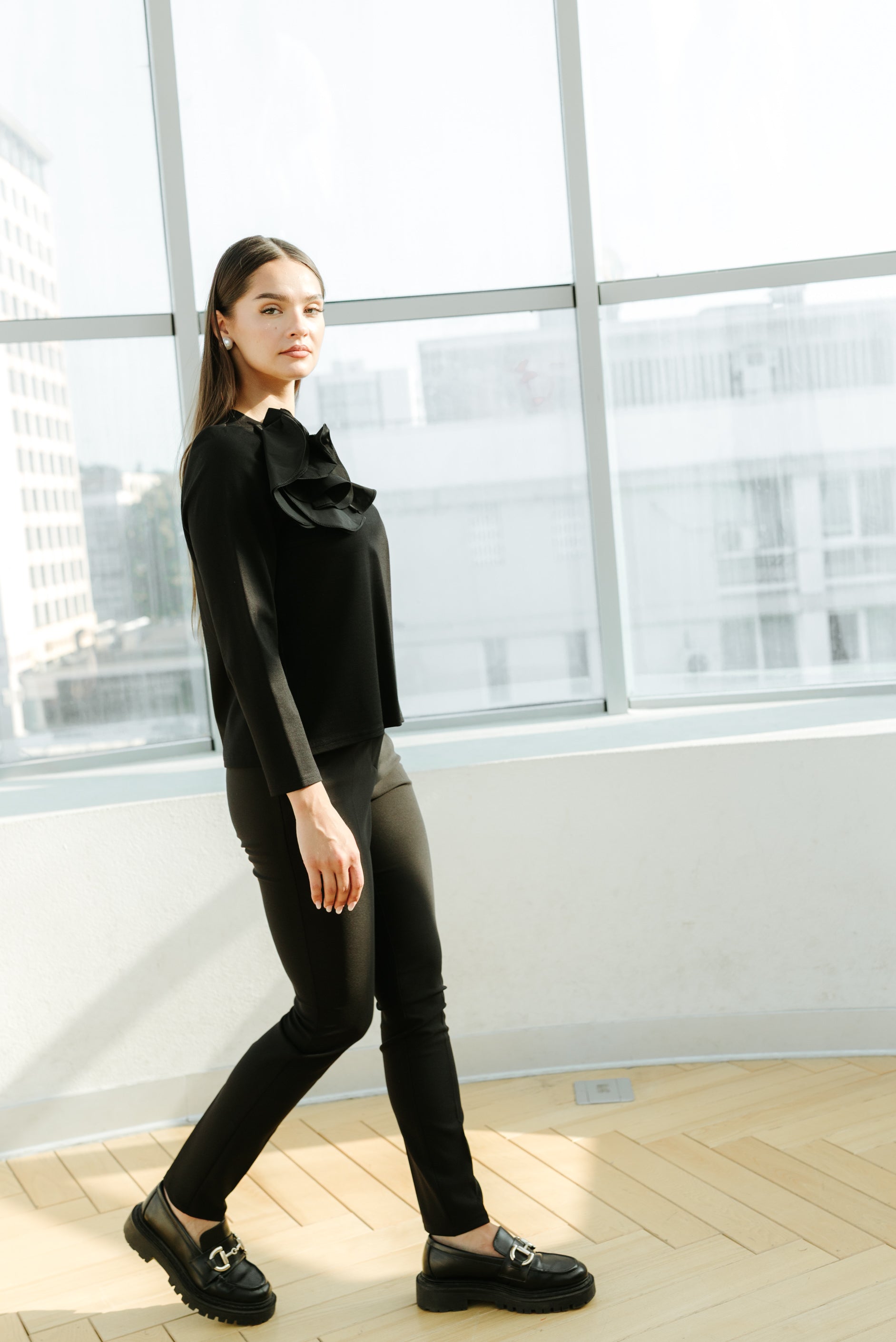 Bluza din jersay cu detalii realizate din fâș negru. Tesatura este fluida si se potriveste oricarui tip de silueta.