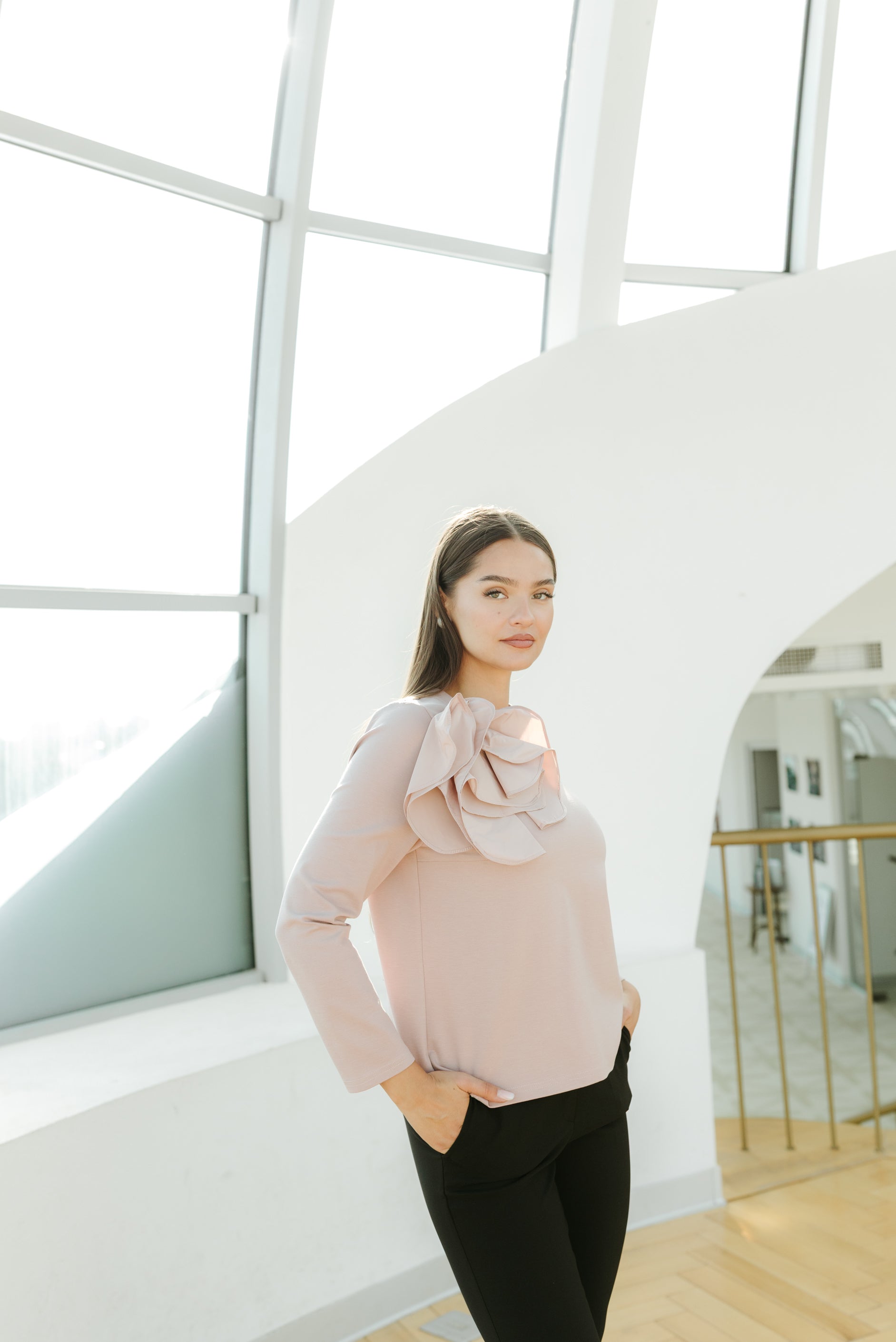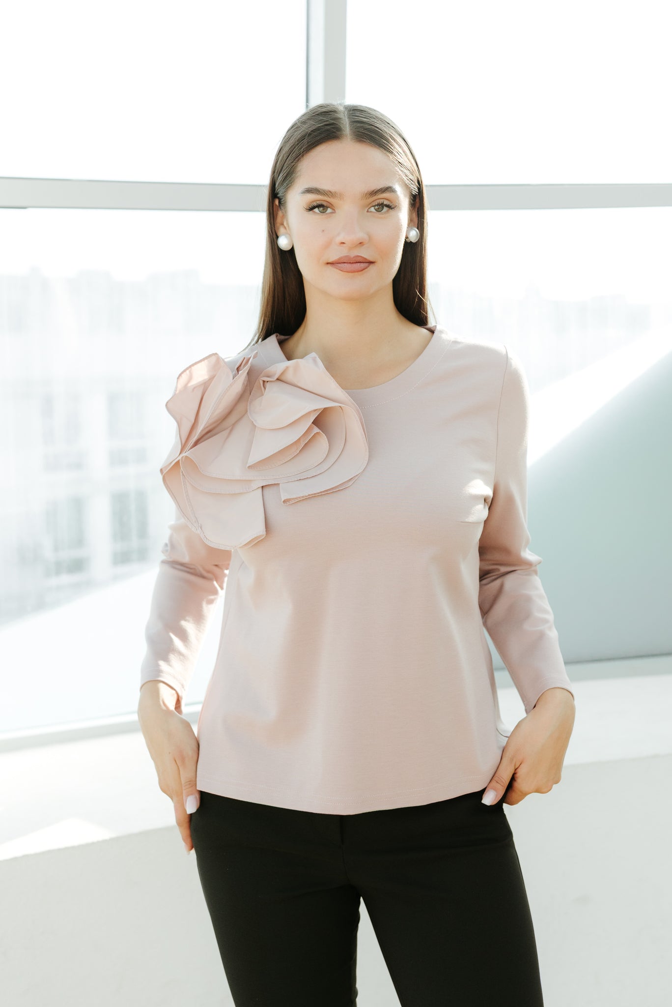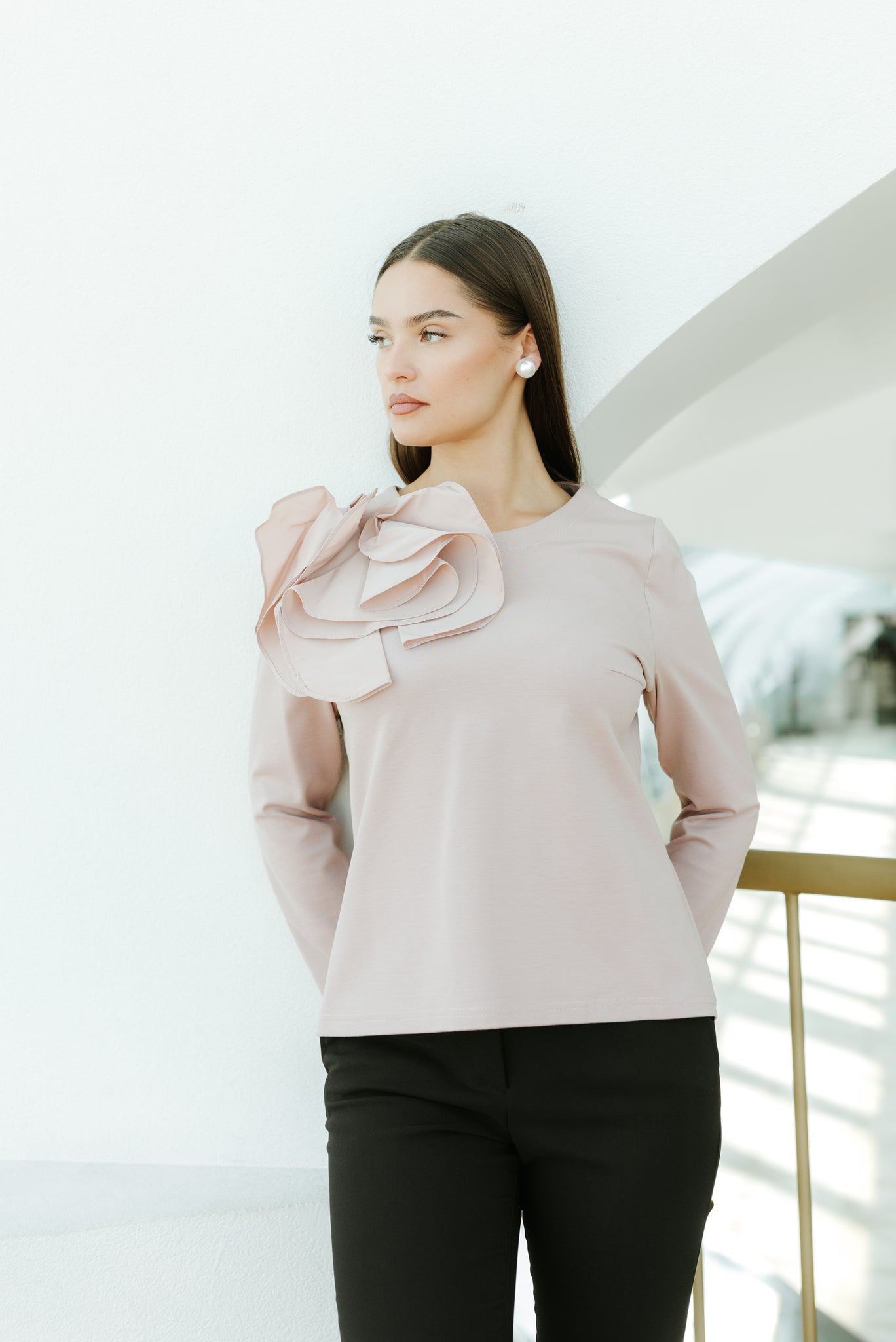 Bluza din jersay cu detalii realizate din fâș. Tesatura este fluida si se potriveste oricarui tip de silueta.