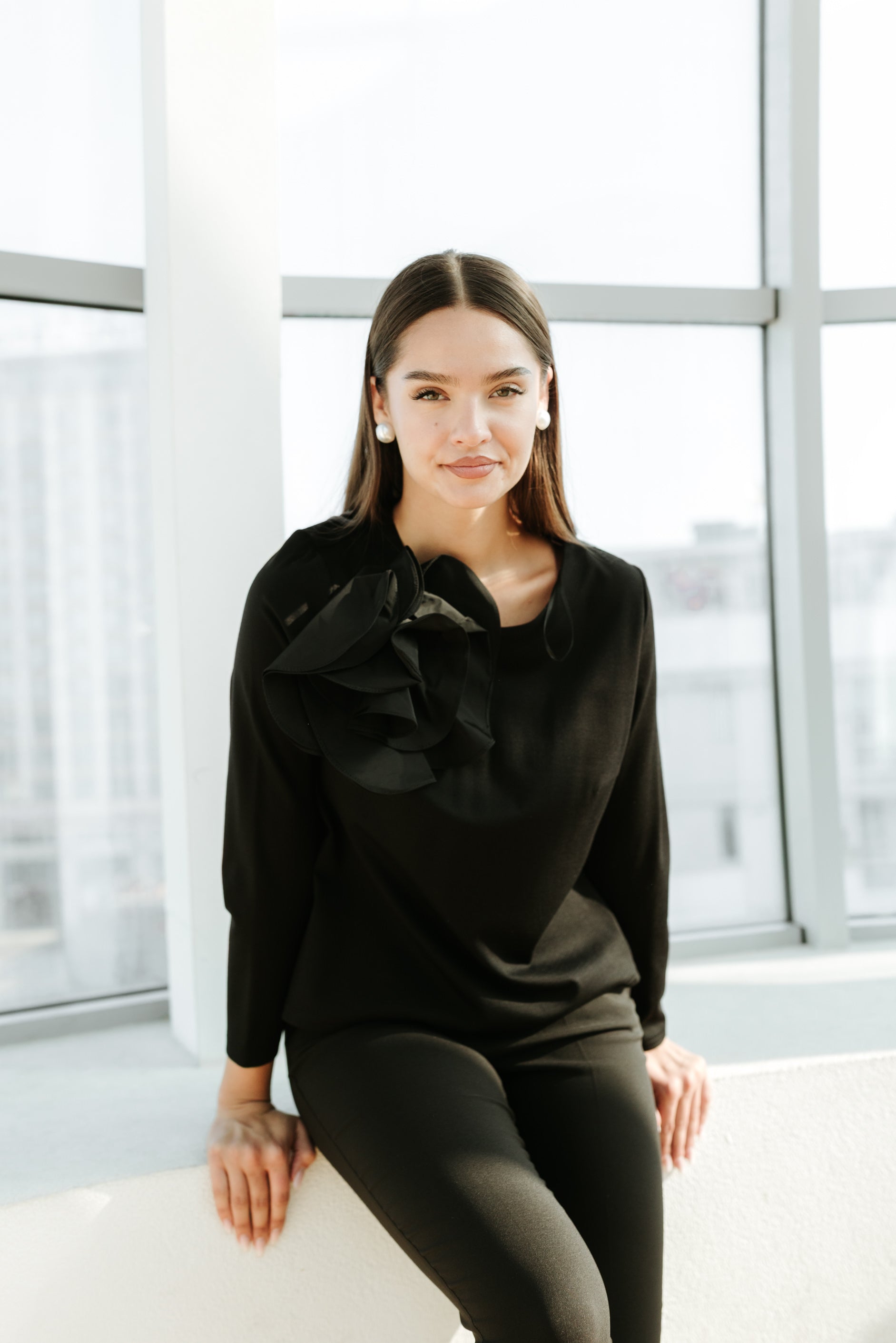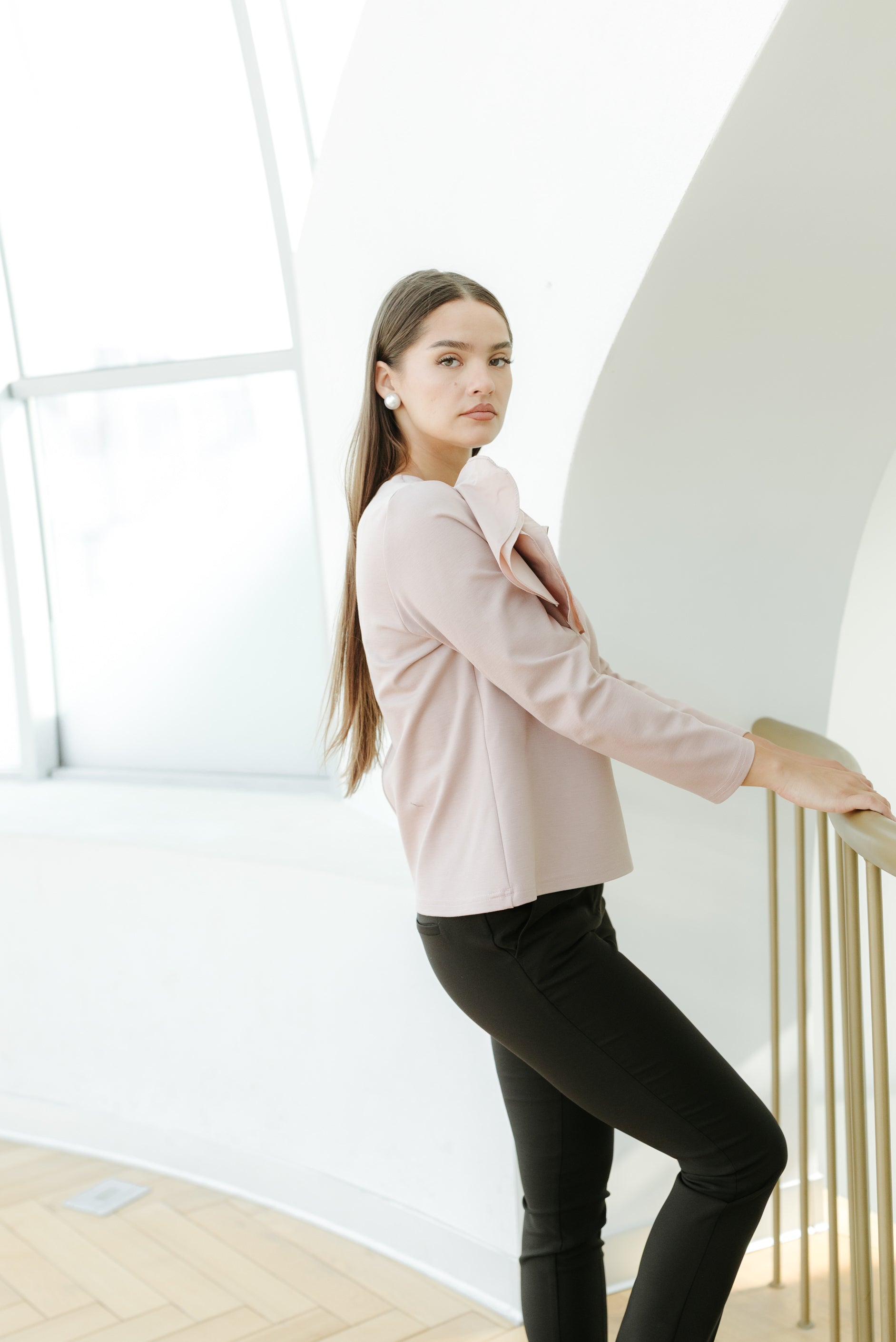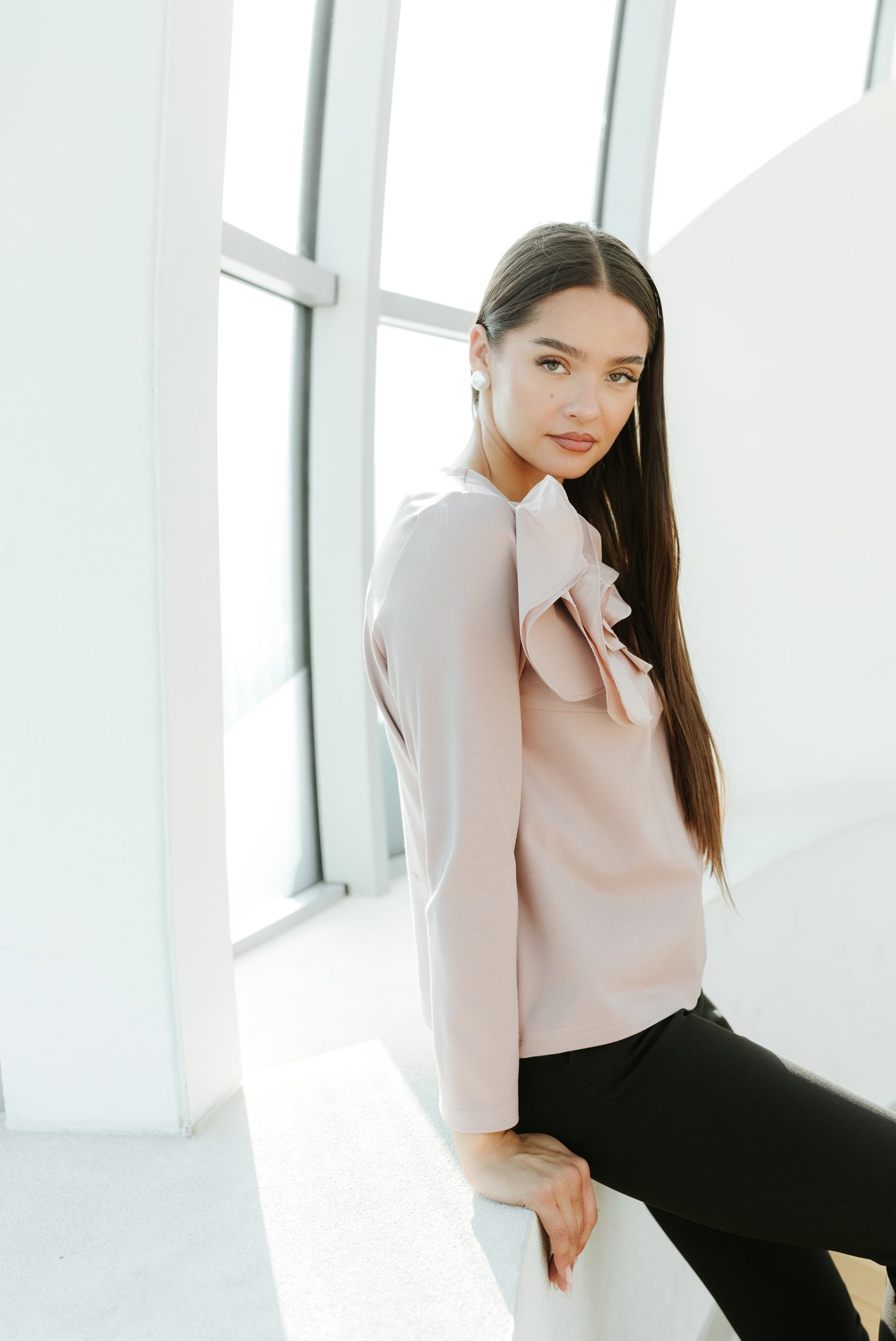 Bluza din jersay cu detalii realizate din fâș. Tesatura este fluida si se potriveste oricarui tip de silueta.
