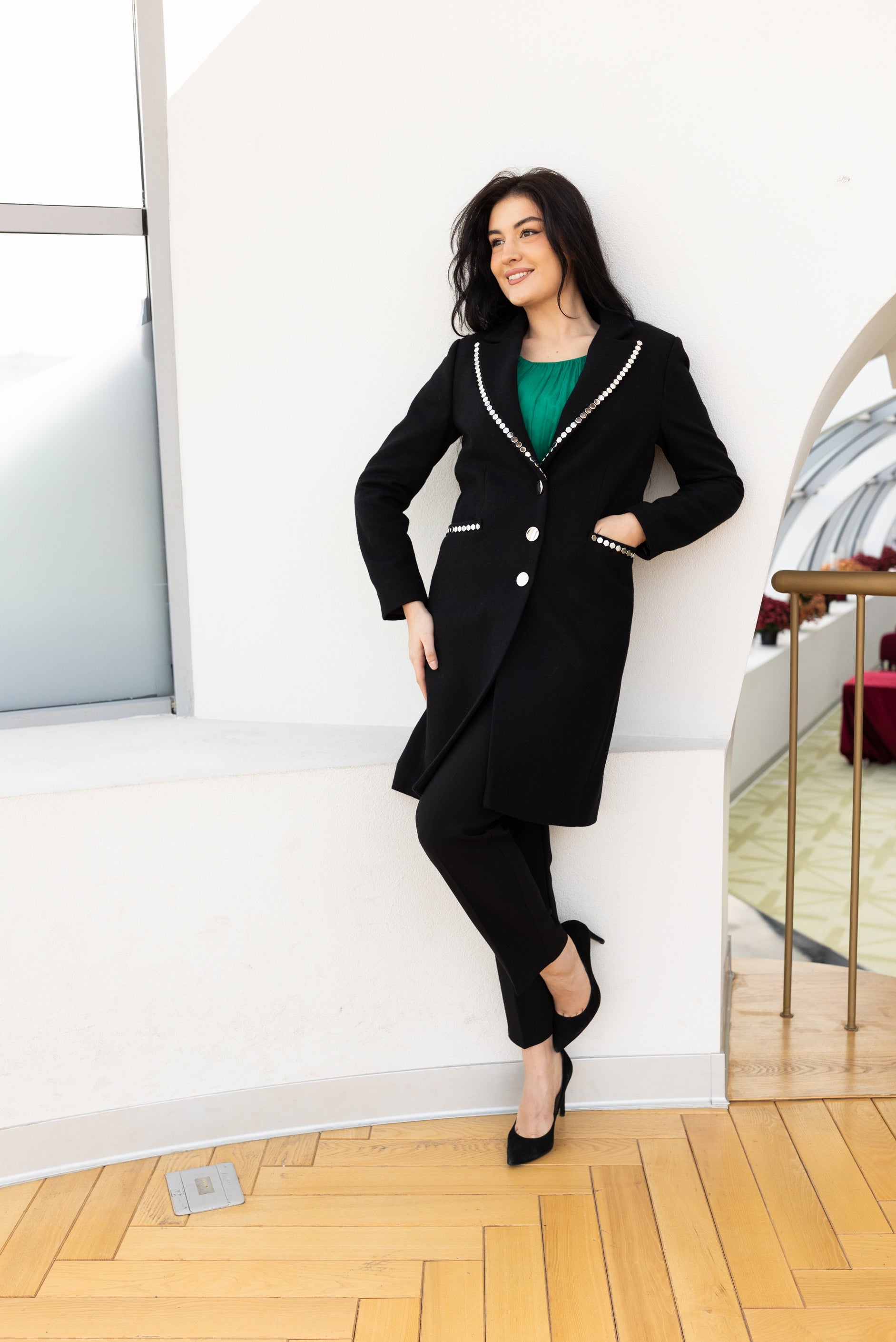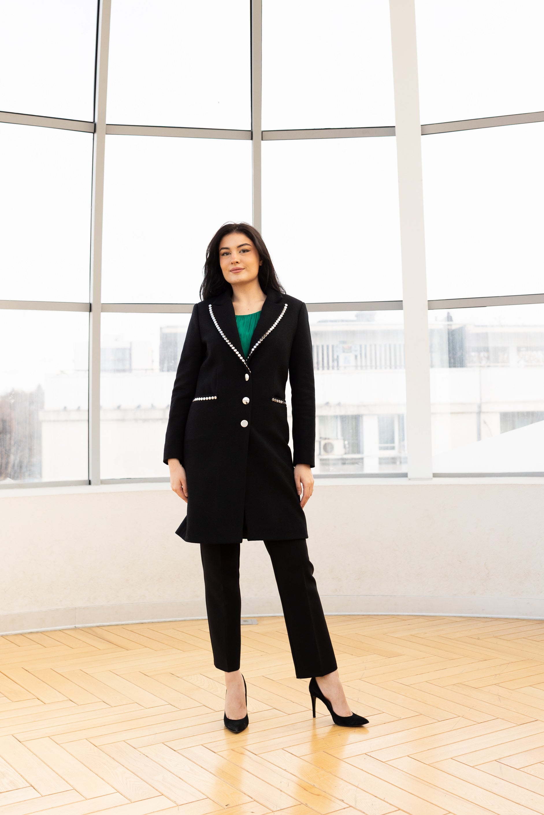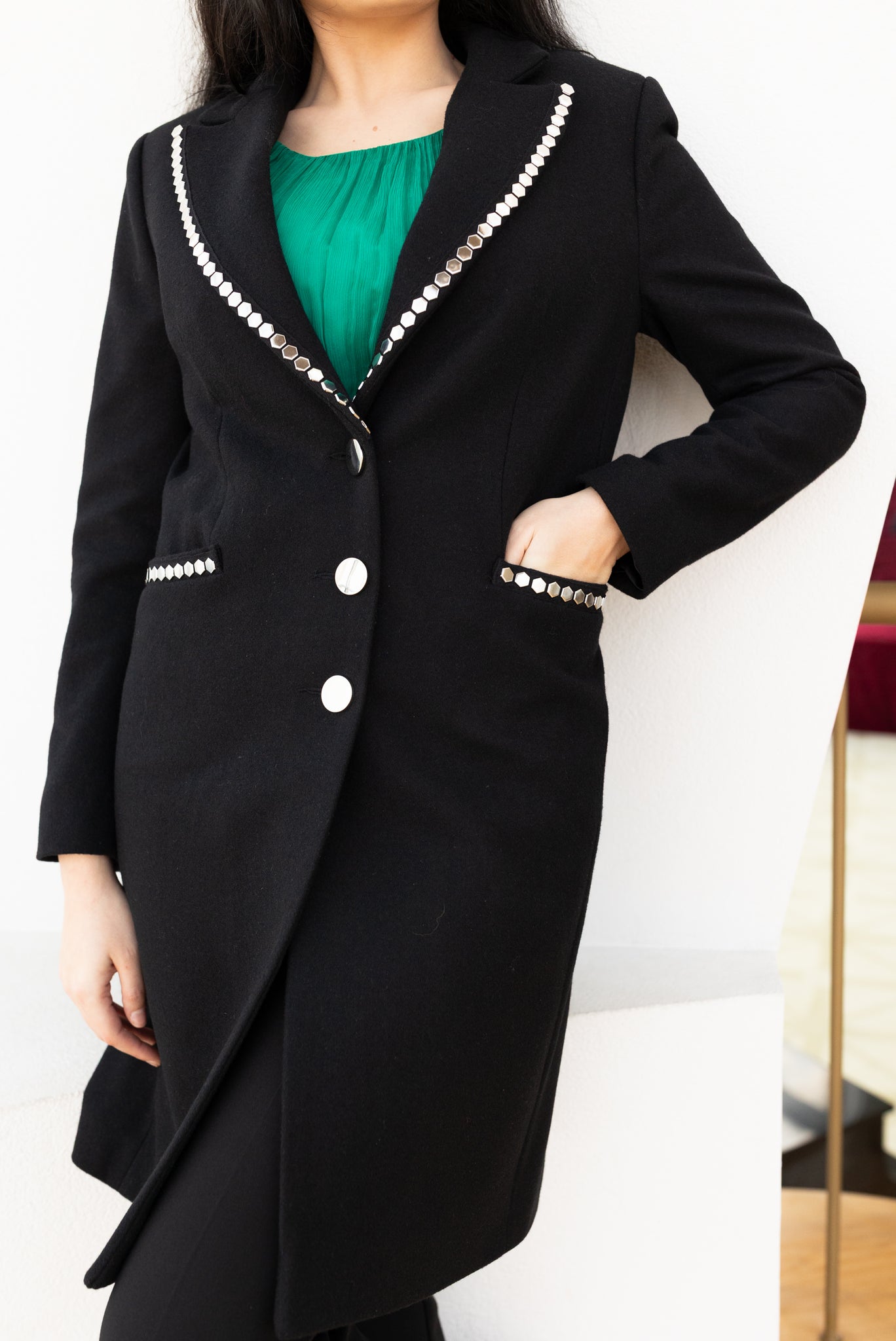Este elegant, dar si casual in acelasi timp. Accesoriile metalice ii confera o nota moderna. Materialul cu lana in compozitie este potrivit pentru sezonul rece, tesatura nu se scamoseaza. Aspectul ei se mentine in timp.