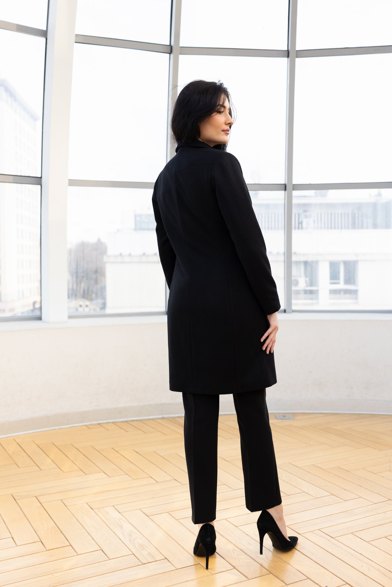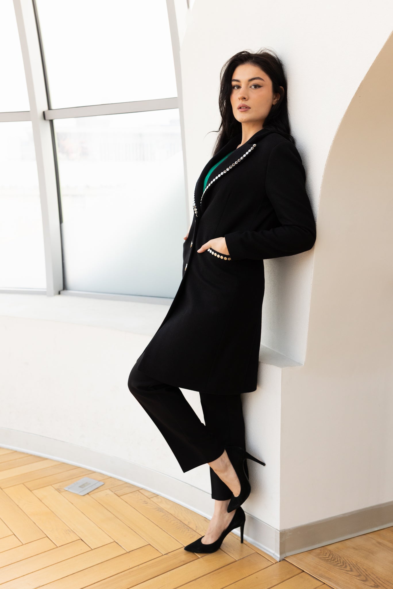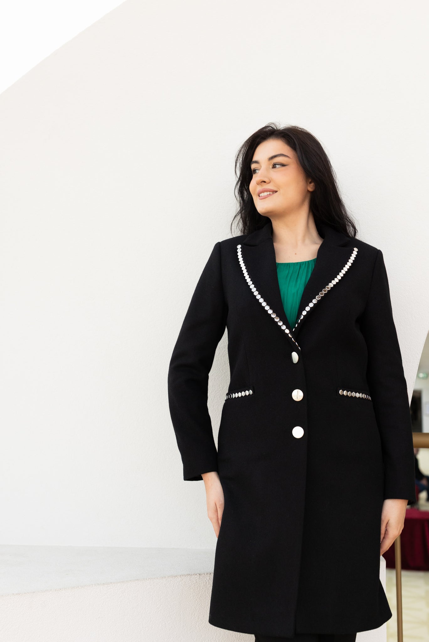 Este elegant, dar si casual in acelasi timp. Accesoriile metalice ii confera o nota moderna. Materialul cu lana in compozitie este potrivit pentru sezonul rece, tesatura nu se scamoseaza. Aspectul ei se mentine in timp.