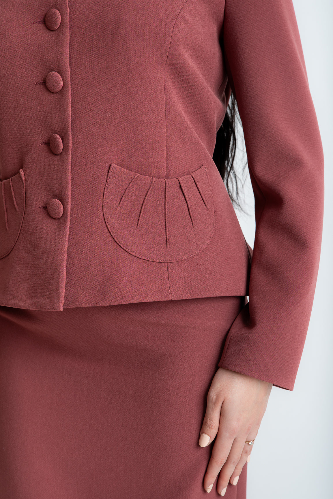 Sacou cambrat cu buzunar aplicat. Sistemul de inchidere se realizeaza cu nasturi imbracati. Maneca este lunga.