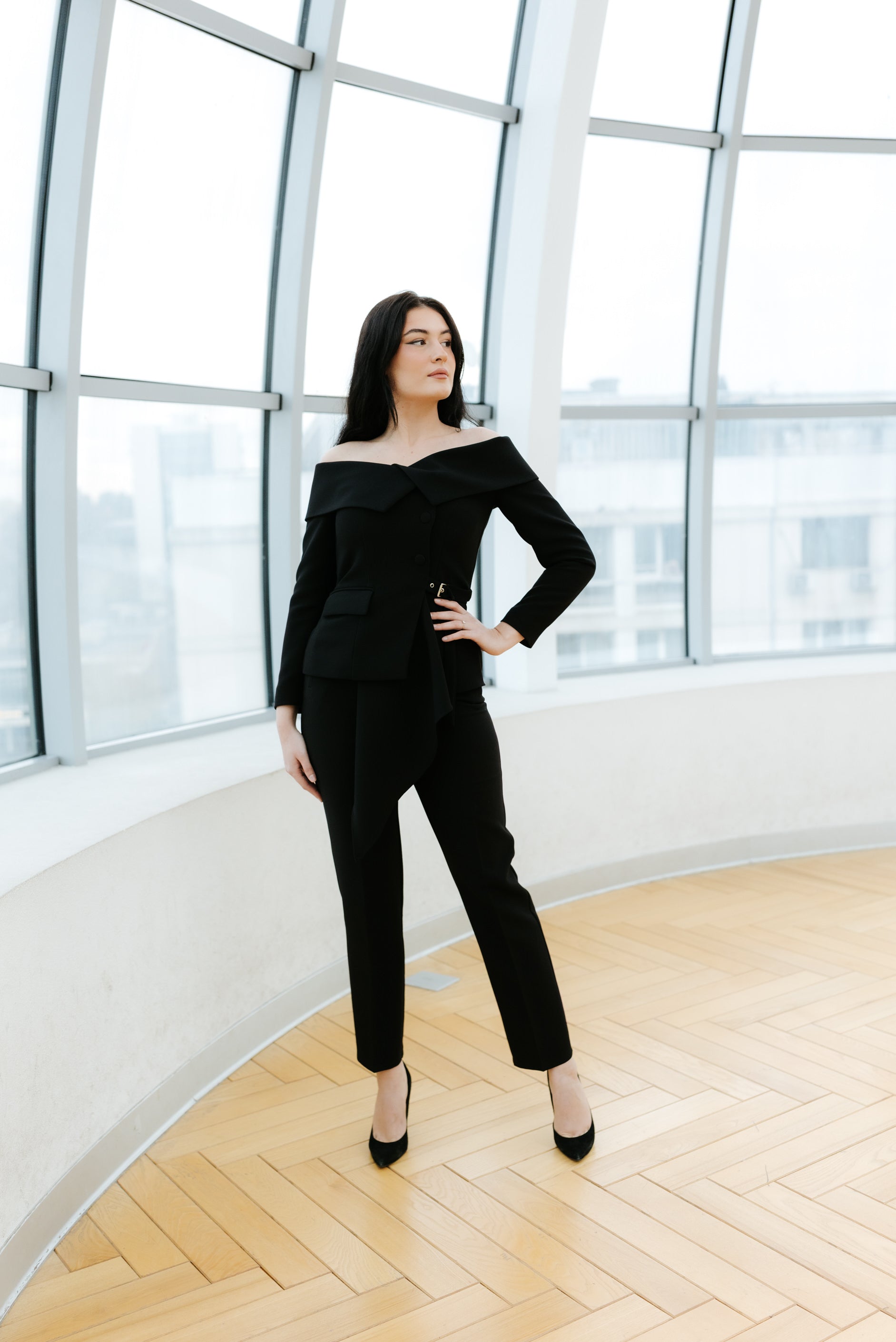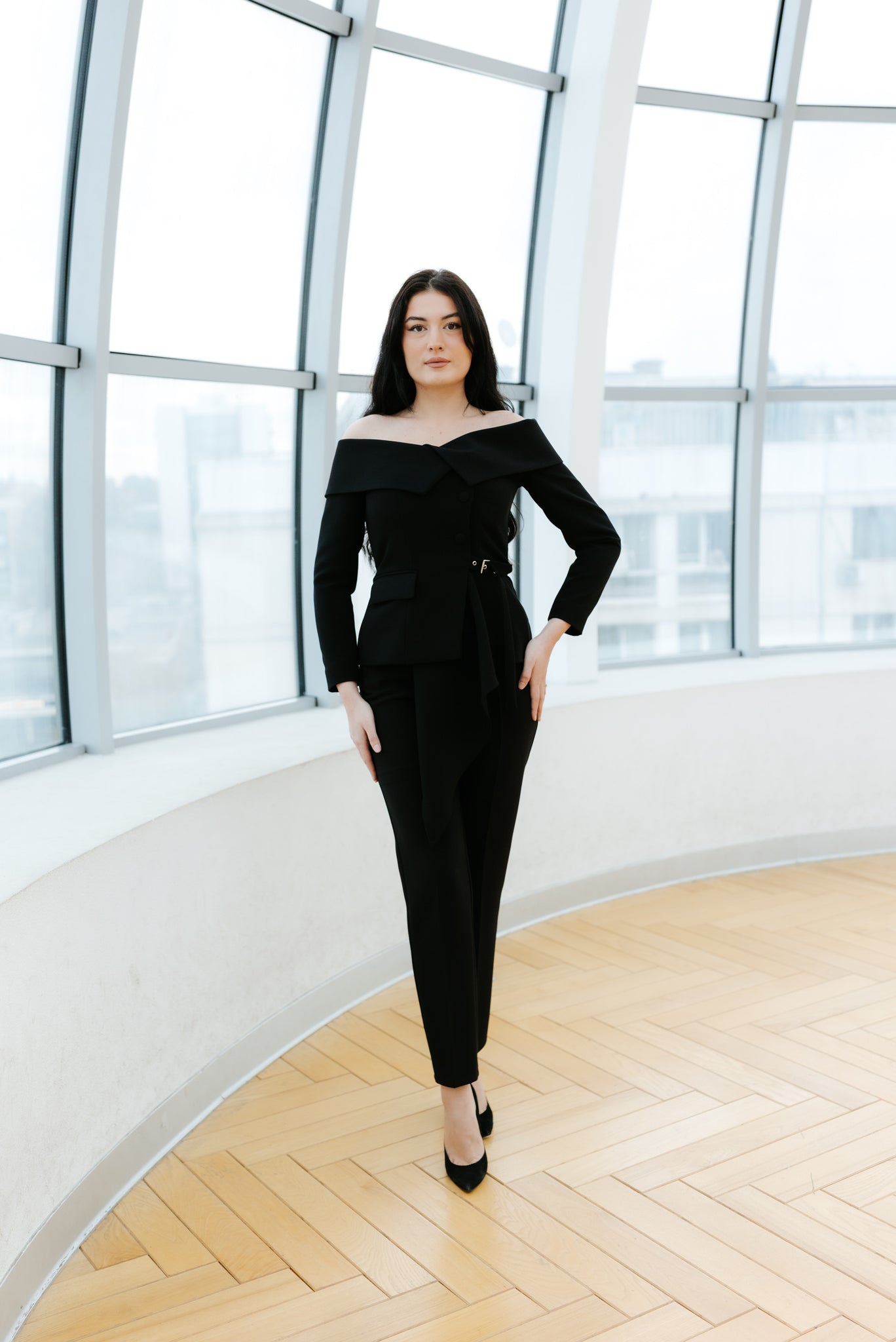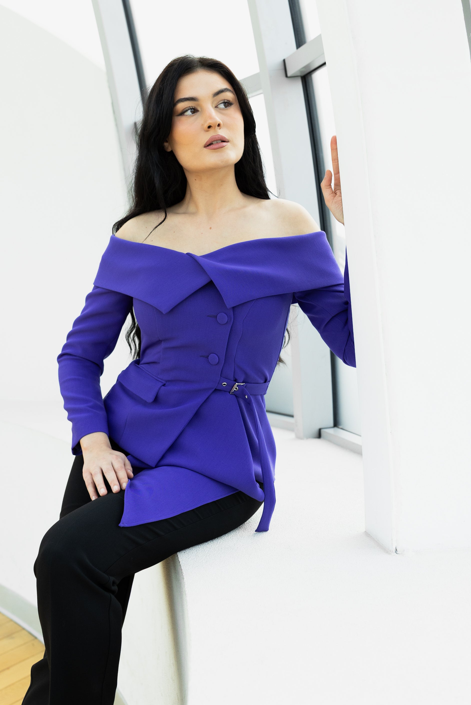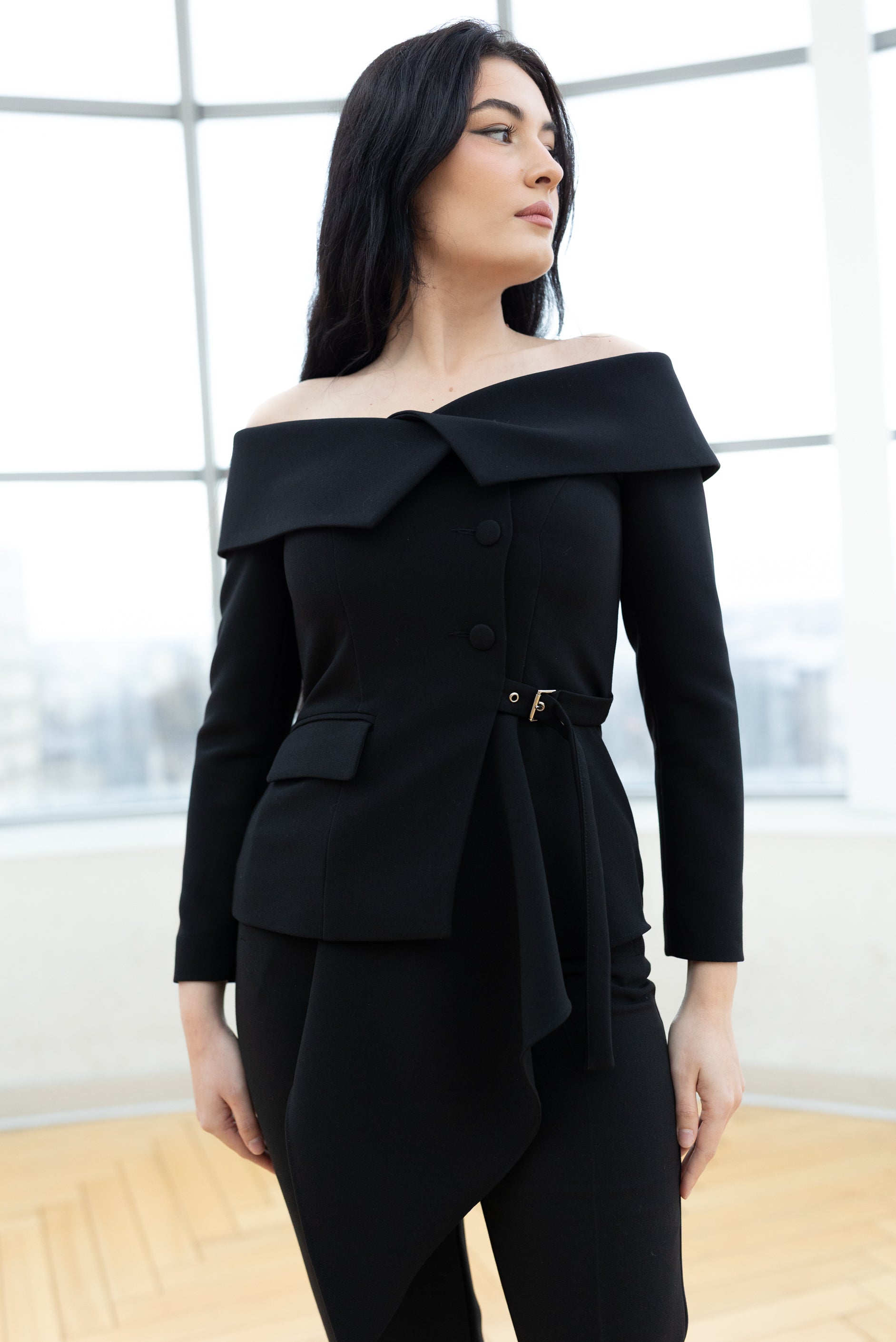 Jacheta este o alegere perfecta din punct de vedere al croielii. Umeii goi au o eleganta deosebita. Cordonul din fata ofera un detaliu chic si permite purtarea jachetei la o pereche de pantaloni clasici sau conici, dar si la o pereche de jeansi.