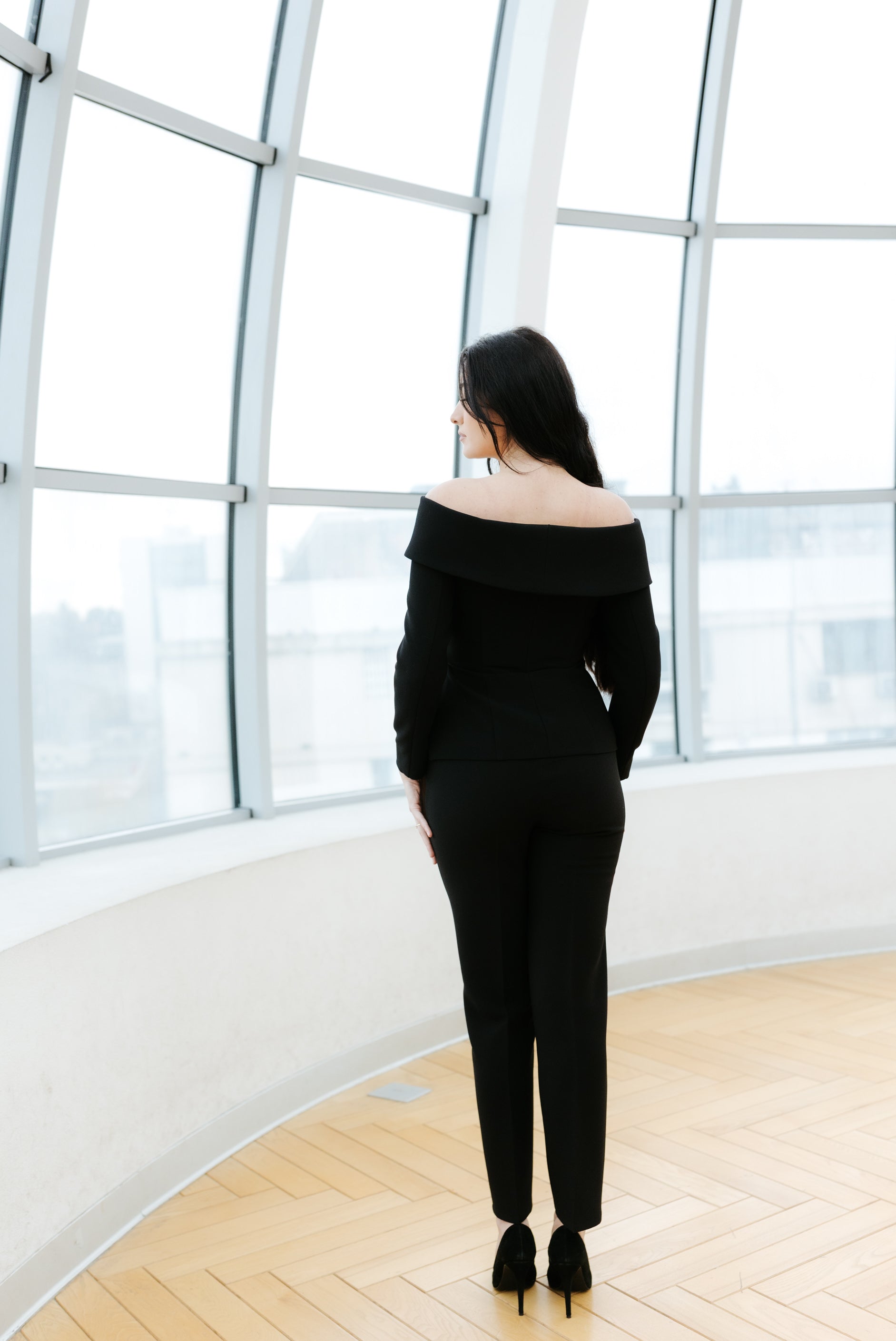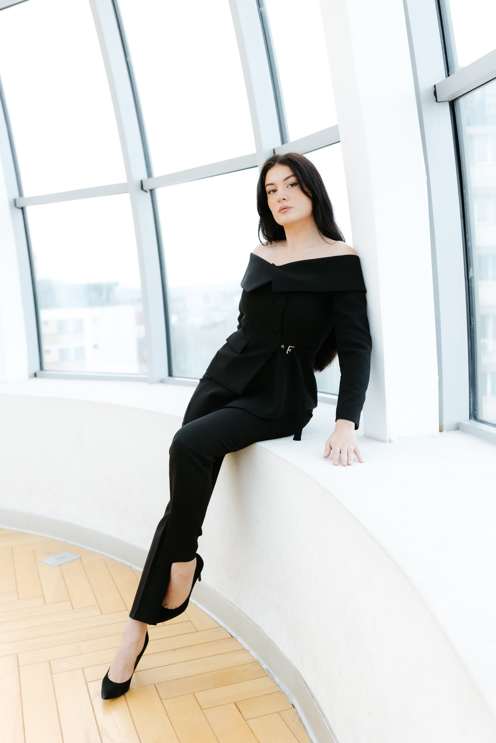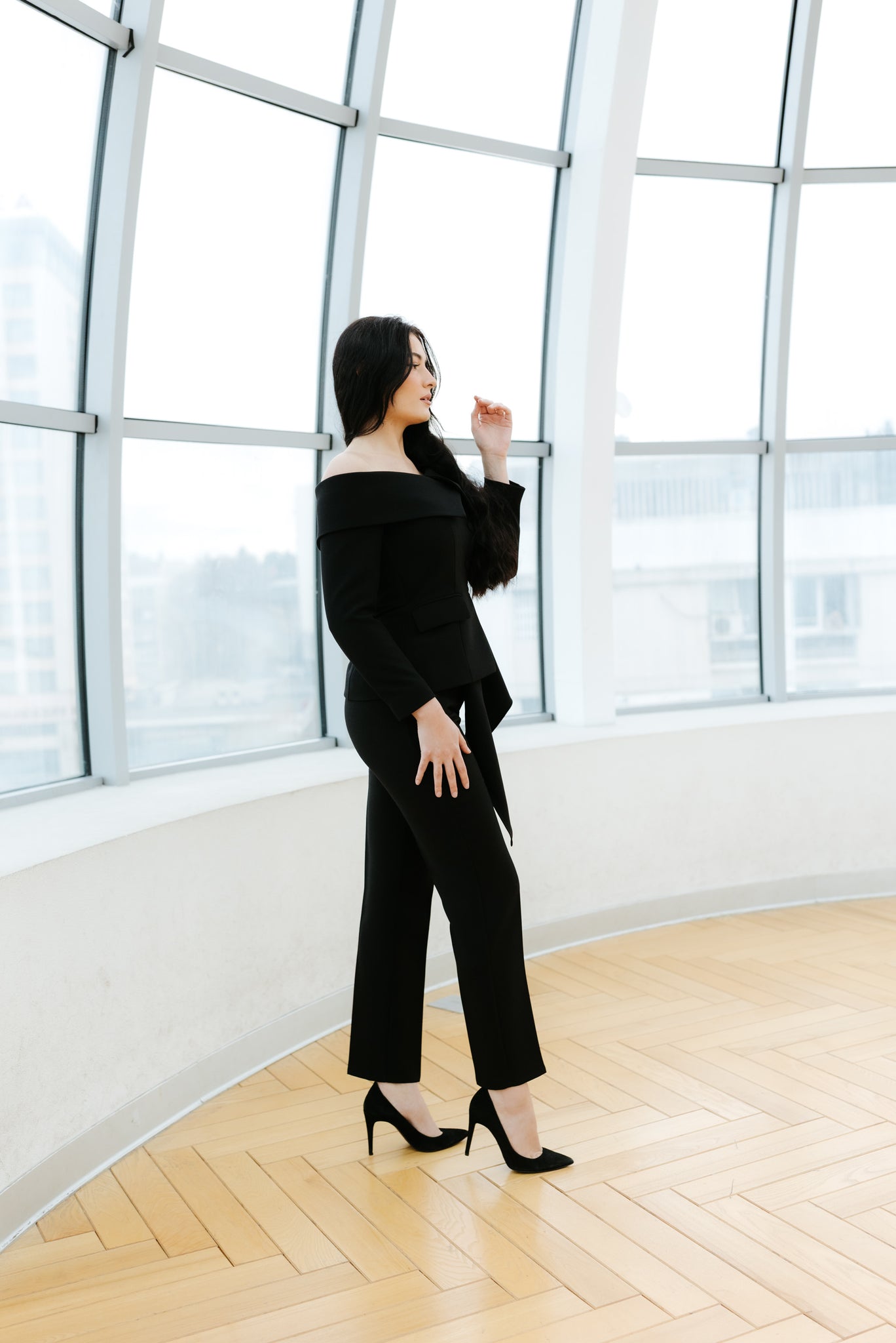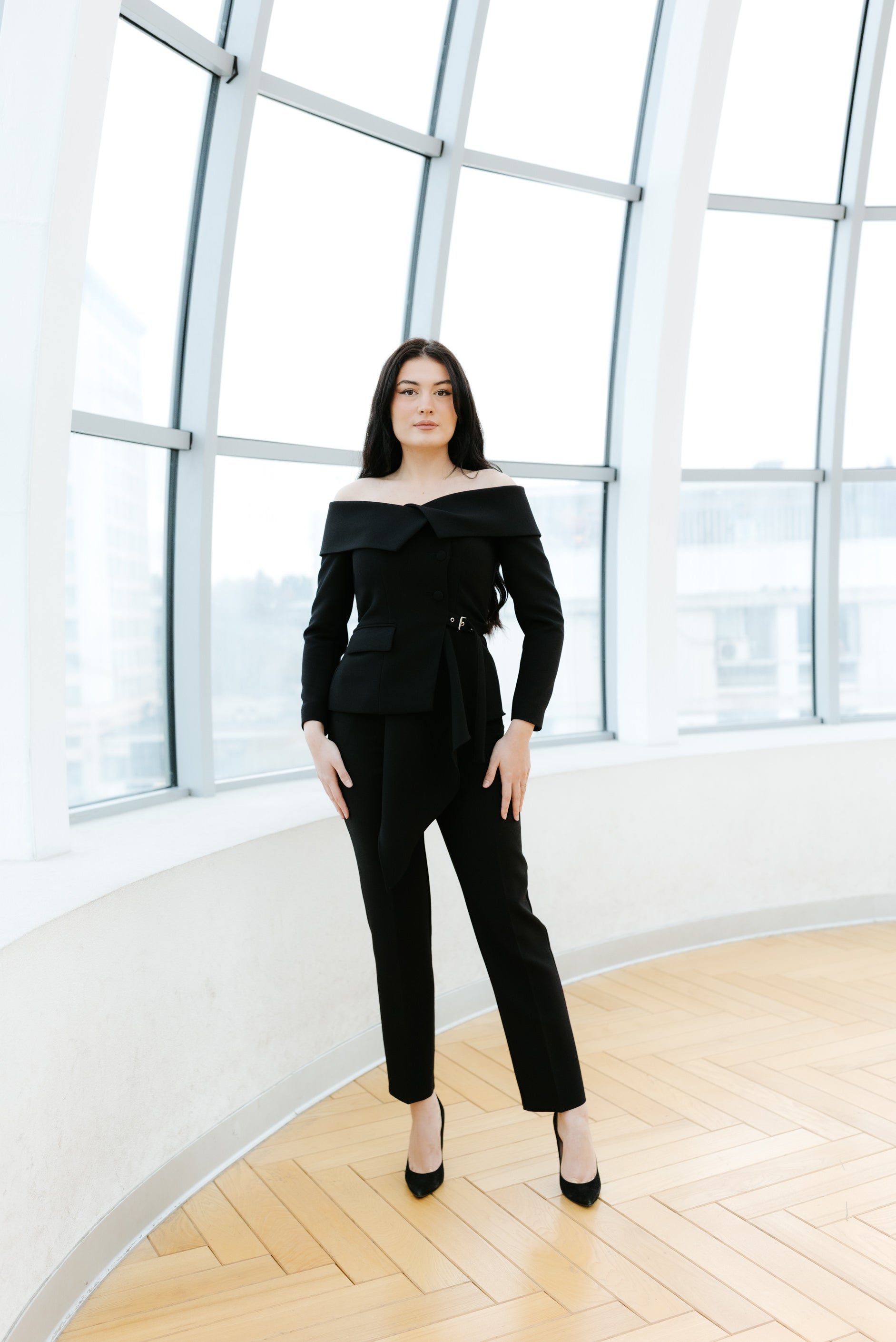 Jacheta este o alegere perfecta din punct de vedere al croielii. Umeii goi au o eleganta deosebita. Cordonul din fata ofera un detaliu chic si permite purtarea jachetei la o pereche de pantaloni clasici sau conici, dar si la o pereche de jeansi.